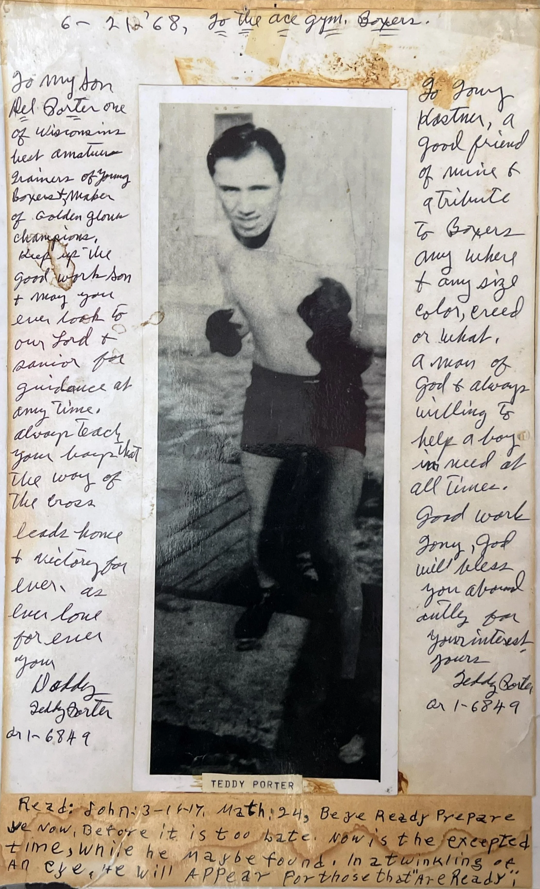 Del Porter was raised in a boxing family, Ted (Cyclone) Porter was a professional boxer from 1923-1933, he never fought as an amateur, and he was a 4 year welter weight Champion in Canada. He had 168 professional fights and lost about 19 of them.